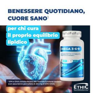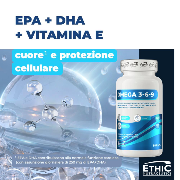 OMEGA 3-6-9 è indicato nei casi di ridotto apporto alimentare di acidi grassi essenziali. La combinazione di EPA+DHA e Vitamina E rappresenta un sostegno quotidiano al benessere cardiovascolare¹ e alla protezione cellulare², contribuendo a un equilibrio nutrizionale ottimale. EPA e DHA (olio di pesce) ? contribuiscono al normale funzionamento cardiaco¹ - ALA (olio di semi di lino) ? acido grasso essenziale precursore degli Omega 3 a lunga catena. - Omega 6 (acido linoleico) ? componente importante del metabolismo lipidico - Omega 9 (acido oleico) ? tipico della dieta mediterranea, contribuisce a un profilo alimentare bilanciato. - Vitamina E ? contribuisce a proteggere le cellule dallo stress ossidativo²