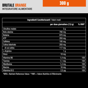 Ingredienti :Citrullina malato, L-arginina, betaina, beta alanina, aroma, acidificante: acido citrico; bitartrato di colina, adenosin trifosfato (ATP), caffeina, colorante: barbabietola rossa in polvere; edulcorante: sucralosio; bisglicinato di zinco, nicotinammide (niacina), cloridrato di piridossina (vitamina B6), riboflavina (vitamina B2), cloridrato di tiamina (vitamina B1), cianocobalamina (vitamina B12).