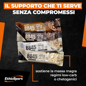 Le barrette BB45TM uniscono praticità e piacere: il formato compatto da 35 g le rende facili da portare ovunque, la copertura al cioccolato o bianca regala varietà e appagamento, mentre la texture bilanciata tra morbido e croccante le rende piacevoli al palato. L’utilizzo di proteine del latte isolate e concentrate assicura un apporto di elevata qualità, ideale anche in regimi low-carb e chetogenici.