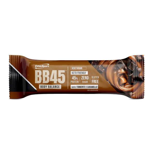 BB45TM significa Body Balance con il 45% di proteine: una barretta compatta, gustosa e funzionale, pensata per unire equilibrio nutrizionale e piacere. Ogni porzione fornisce proteine ad alto valore biologico, senza zuccheri e senza glutine, ed è perfetta per chi segue una dieta Keto o un piano a basso contenuto glucidico.