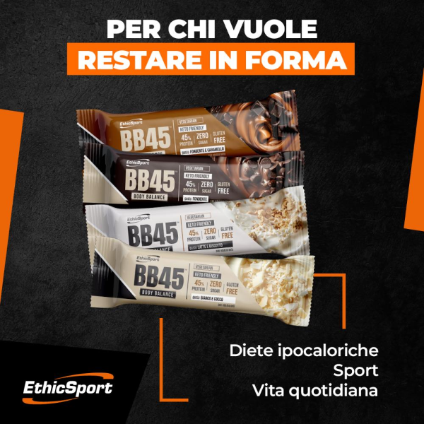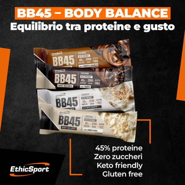 BB45TM significa Body Balance con il 45% di proteine: una barretta compatta, gustosa e funzionale, pensata per unire equilibrio nutrizionale e piacere. Ogni porzione fornisce proteine ad alto valore biologico, senza zuccheri e senza glutine, ed è perfetta per chi segue una dieta Keto o un piano a basso contenuto glucidico.