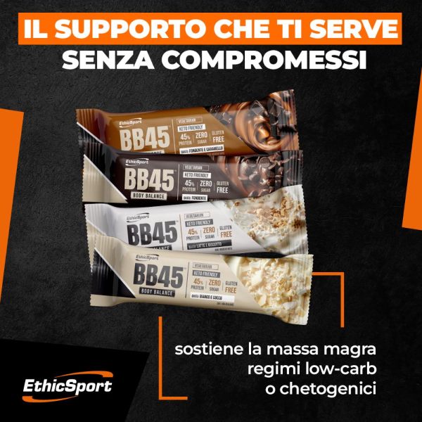BB45TM significa Body Balance con il 45% di proteine: una barretta compatta, gustosa e funzionale, pensata per unire equilibrio nutrizionale e piacere. Ogni porzione fornisce proteine ad alto valore biologico, senza zuccheri e senza glutine, ed è perfetta per chi segue una dieta Keto o un piano a basso contenuto glucidico.