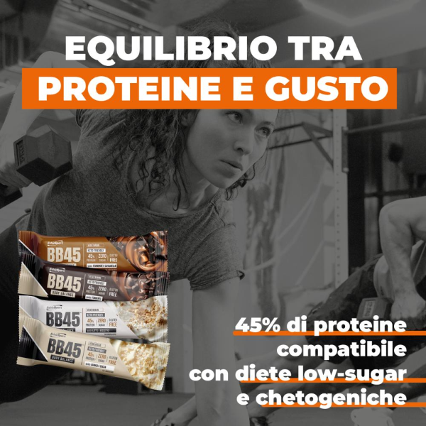 BB45TM è una barretta moderna, studiata per chi vuole qualità, gusto e bilanciamento in ogni momento della giornata.