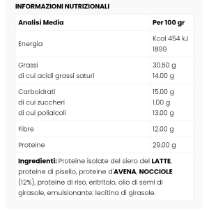 proteine del LATTE, proteine di pisello, cacao (12%), proteine di riso, edulcoranti: eritritolo, collagene idrolizzato, fibra di cacao , olio extra vergine d'oliva, NOCCIOLE (7%), olio di semi di girasole, emulsionante: lecitina di girasole.