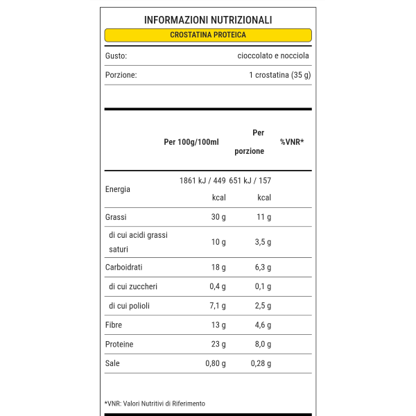 crema al gusto cioccolato con edulcorante (35%) (pasta di cacao, edulcorante: maltitolo, burro di cacao, emulsionante: lecitina di soia, aroma naturale di vaniglia, pasta di nocciola, olio di palma raffinato); miscela di proteine (proteine isolate di soia, proteine concentrate del siero del latte, albume d’uovo in polvere); burro (latte); fibra alimentare idrosolubile; polidestrosio; farina di frumento; amido di mais; edulcorante: maltitolo; uovo; fibre vegetali [fibra di bambù, FOS (frutto-oligosaccaridi)]; agenti lievitanti: difosfati, carbonati di sodio; addensante: farina di semi di carrube; emulsionante: lecitina di soia; aroma vaniglia; aromi; sale; antiossidante: alfatocoferolo. Può contenere altra frutta a guscio, arachidi, sesamo, senape, solfiti, sedano.