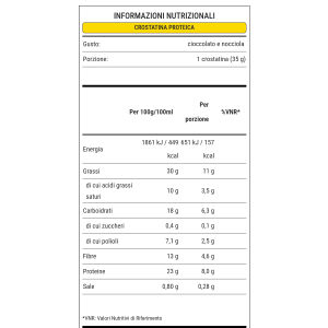 crema al gusto cioccolato con edulcorante (35%) (pasta di cacao, edulcorante: maltitolo, burro di cacao, emulsionante: lecitina di soia, aroma naturale di vaniglia, pasta di nocciola, olio di palma raffinato); miscela di proteine (proteine isolate di soia, proteine concentrate del siero del latte, albume d’uovo in polvere); burro (latte); fibra alimentare idrosolubile; polidestrosio; farina di frumento; amido di mais; edulcorante: maltitolo; uovo; fibre vegetali [fibra di bambù, FOS (frutto-oligosaccaridi)]; agenti lievitanti: difosfati, carbonati di sodio; addensante: farina di semi di carrube; emulsionante: lecitina di soia; aroma vaniglia; aromi; sale; antiossidante: alfatocoferolo. Può contenere altra frutta a guscio, arachidi, sesamo, senape, solfiti, sedano.