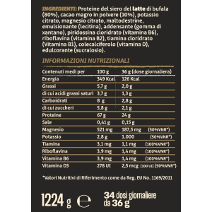 Proteine del siero del latte di bufala (80%), cacao magro in polvere (10%), potassio citrato, magnesio citrato, maltodestrine, emulsionante (lecitina), addensante (gomma di xantano), piridossina cloridrato (Vitamina B6), riboflavina (Vitamina B2), tiamina cloridrato (Vitamina B1), colecalciferolo (Vitamina D), edulcorante (sucralosio)