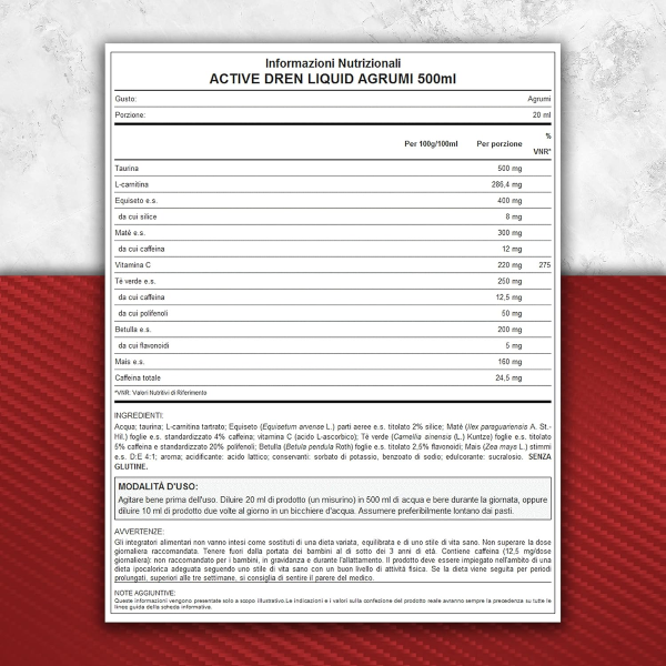 Acqua; taurina; L-carnitina tartrato; equiseto (Equisetum arvense L.) parti aeree e.s. tit 2% silice; garcinia (Garcinia cambogia (Gaernt) Desr.) frutti e.s. tit. 60% in acido idrossicitrico; vitamina C (acido L-ascorbico); tè verde (Camellia sinensis (L.) Kuntze) foglie e.s. tit 5% caffeina, tit 20% polifenoli; betulla (Betula pendula Roth) foglie e.s. tit. 2,5% flavonoidi; mais (Zea mays L.) stimmi e.s. D:E 4:1; aroma; acidificante: acido lattico; conservanti: sorbato di potassio, benzoato di sodio; edulcorante: sucralosio. SENZA GLUTINE.