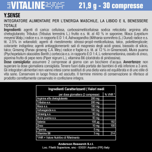 Ingredienti: Agenti di carica: cellulosa, carbossimetilcellulosa sodica reticolata; arginina alfa chetoglutarato; Tribulus (Tribulus terrestris L.) frutto e.s. tit. al 40 % in saponine, Maca (Lepidium meyenii Walp.) radice e.s. in rapporto E:D 1:4, Ashwagandha (Withania somnifera (L.) Dunal) radice e.s. tit. 2.5% in witanolidi; agenti di rivestimento: idrossi-propil-metilcellulosa, talco, polietilenglicole; colorante: indigotina; agenti antiagglomeranti: sali di magnesio degli acidi grassi, biossido di silicio, talco; Ginseng (Panax ginseng C.A. Mey.) radice e foglie e.s. tit. al 12 % in Ginsenosidi, Muira puama (Ptychopetalum olacoides Benth.) corteccia e.s. in rapporto E:D 1:4, L-selenometionina, ossido di zinco, piperina frutto di pepe nero (Piper nigrum L.), vitamina B6 (cloridrato di piridossina).