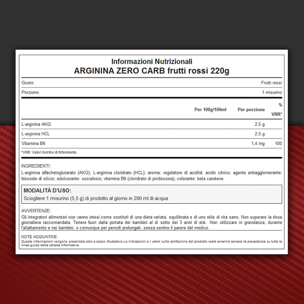 Arginina Zero Carb?è un integratore alimentare a base di arginina alfa-chetoglutarato (AKG) e arginina cloridrato (HCL). L’arginina alfa-chetoglutarato (AKG) fa parte degli aminoacidi semi-essenziali in quanto può essere prodotta dal corpo, ma spesso, come nel caso di situazioni di stress, non in quantità sufficienti. È anche un aminoacido proteinogenico (precursore delle proteine) e quindi di fondamentale importanza per la costruzione muscolare. È coinvolta in diversi processi dell’organismo, ma in particolare sostiene la formazione di ossido nitrico (NO) che promuove la vasodilatazione e il miglioramento della circolazione, favorendo un rapido afflusso di nutrienti ai muscoli e quindi maggiore energia e potenza. Se assunta dopo l’allenamento può accelerare i tempi di recupero migliorando il recovery muscolare. È indispensabile per il mantenimento di numerose funzionalità fisiologiche tra cui la produzione di creatina, una molecola essenziale per il sistema muscolare in quanto utilizzata per la produzione di energia. Possiede anche un’importante azione detossificante per l’organismo: è un prodotto intermedio del ciclo dell’urea per cui presiede all’eliminazione dell’ammoniaca contrastando il senso di fatica determinato dal suo accumulo a livello muscolare.